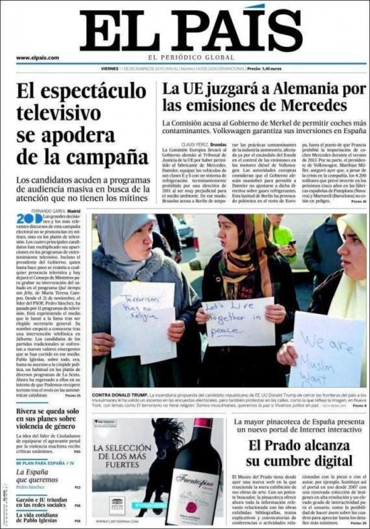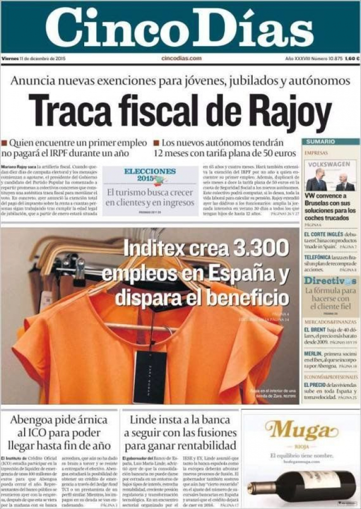 "Traca fiscal de Rajoy" es la impresión de Cinco Días tras el anuncio de las "nuevas exenciones para jóvenes, jubilados y autónomos". Mientras que La Vanguardia analiza la ambigüedad calculada del candidato socialista: "Sánchez arriesga al advertir que no ganar será un fracaso" y añade que "los dirigentes del PSOE interpretan que busca la movilización del partido" y sus "críticos creen que ha vinculado su continuidad con la victoria". Alberto Garzón, de Izquierda Unida, que está triunfando en otro nuevo medio, Internet, no dudó anoche en denunciar lo que considera conformismo por parte de los cuatro partidos favoritos respecto a un "sistema de precariedad y desigualdad" que a su juicio puede traer de vuelta el fascismo a España y al resto de Europa".