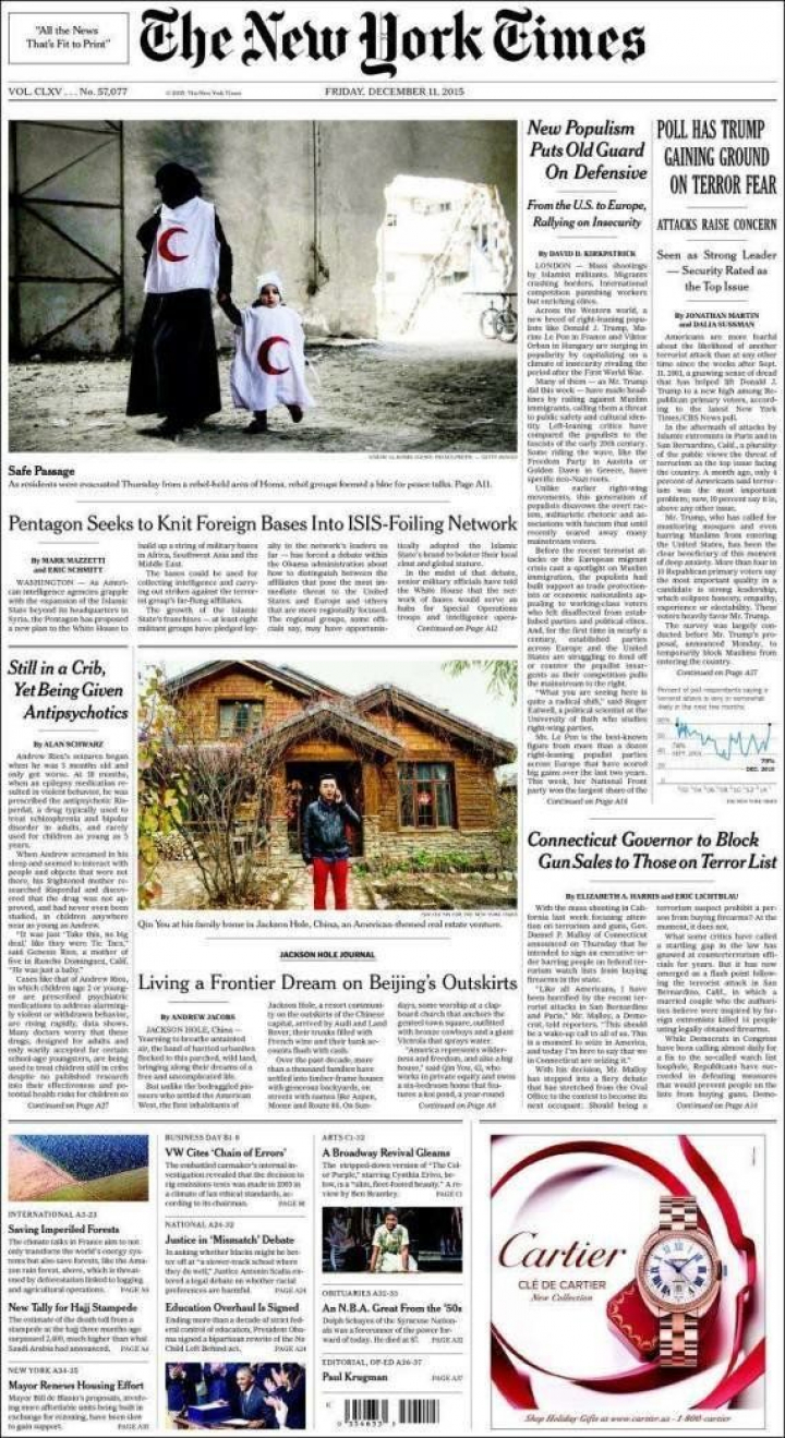 Philip Stephens, en Financial Times, se atreve a establecer comparaciones entre la líder del Frente Nacional y el candidato a las primarias republicanas y su conclusión es que "Le Pen, y no Trump, es el mayor peligro" porque propone volver a una Europa del pasado que creíamos haber dejado atrás. Una Europa que, en Alemania, reaparece con la reedición después de 70 años del libro de Aldolf Hitler, Mein Kampk, que ya tiene fecha de salida, como anuncia El Mundo: el 8 de enero de 2016, cuando los derechos vuelvan al dominio público.