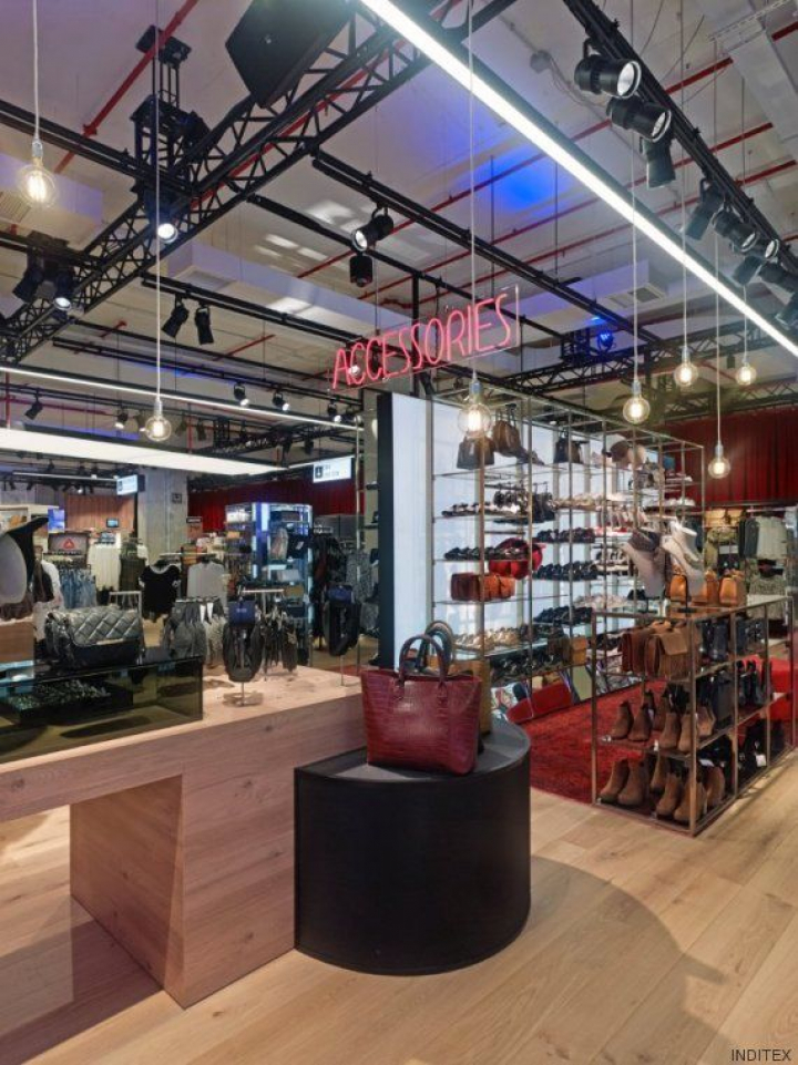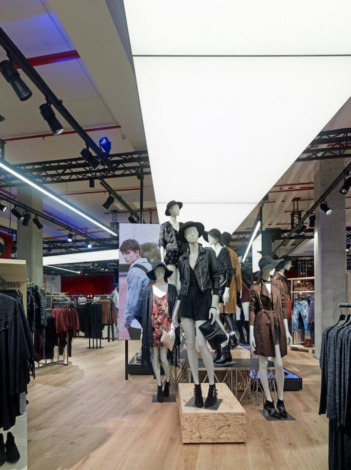 La forma de presentar el producto y el diseño de sus tiendas es cada vez más determinante en el caso de Bershka. En su renovación ha cambiado prácticamente todo: desde el concepto en general (más abierto, limpio, con un toque industrial) a las paredes (desnudas, al aire), los techos (abiertos), la iluminación (con focos y luces directas), los muebles (fáciles de mover y polivalentes) y sus materiales (de conglomerado y reciclados, de bosques de no hace más de 15 años), los maniquíes (situados juntos cual groupies), la señalética (con carteles digitales donde se ven las prendas, cómo quedan y sus precios, además de con grandes carteles de luces led), la colocación de la ropa (mucho más doblada que colgada), las zonas de las prendas (se separa el área denim mientras que los complementos se agrupan), el escaparate (separado de la tienda con una cortina para entrever el interior desde fuera) o los probadores (situados tras gruesos cortinajes de terciopelo rojo).