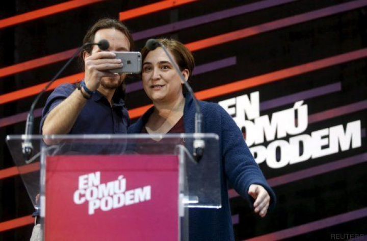 Ada Colau y Pablo Iglesias se hacen un 'selfie' en el mitin de Badalona.