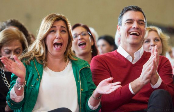 El mitin de Sevilla era una cita clave para la campaña del socialista Pedro Sánchez, siendo como es la capital de la provincia que más votos le reporta a su partido desde que la democracia regresó a España. Estaba llamado a competir con el de Podemos en Zaragoza, pero el pique añadido de su aparición junto a Susana Díaz se ha terminado imponiendo. Todos los ojos estaban sobre ellos que, esta vez sí, aparecieron más unidos, más cómplices, aunque sin pasarse. Todo sea por la campaña. Y, en un momento, a los dos se les fue la carcajada. Esta foto dará para muuuuchos memes.