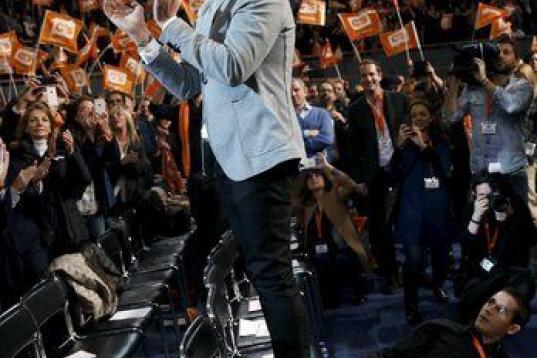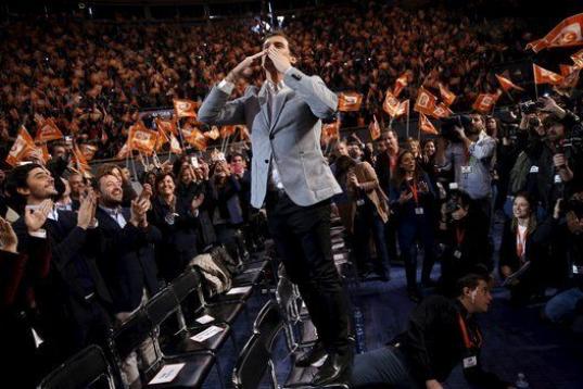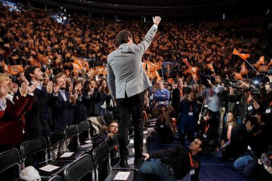 El candidato de Ciudadanos a la presidencia del Gobierno decidió subirse a una silla para saludar a los asistentes al acto de campaña de Vistalegre (Madrid). Por miedo a que la silla cediese, un miembro de organización del partido presta su cuerpo para la causa y mete la rodilla bajo el asiento, en posición forzada, para que éste resista el peso. Veamos primero las imágenes: