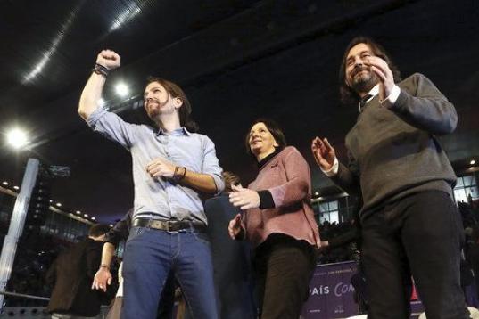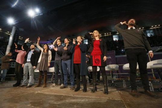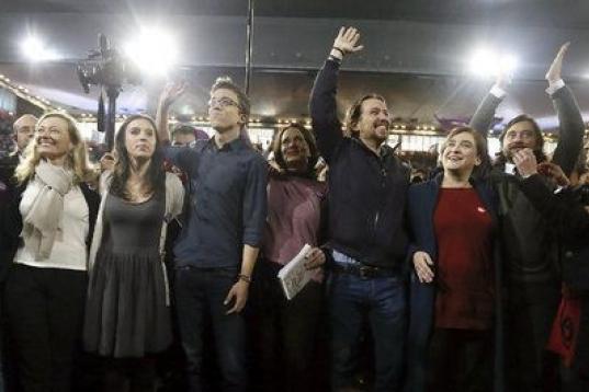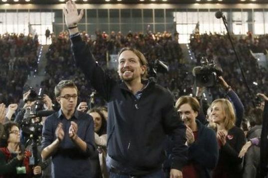 "¡Vamos a ganarles las elecciones, señores de lo viejo!", dijo el candidato de Podemos, emocionado hasta la lágrima ante un auditorio entregado, que abucheó cada vez que se nombraba a Rajoy, a Ciudadanos y a Pedro Sánchez, aplaudió la intervención de la alcaldesa de Barcelona, Ada Colau, y ovacionó las menciones a su homóloga en Madrid, Manuela Carmena.
