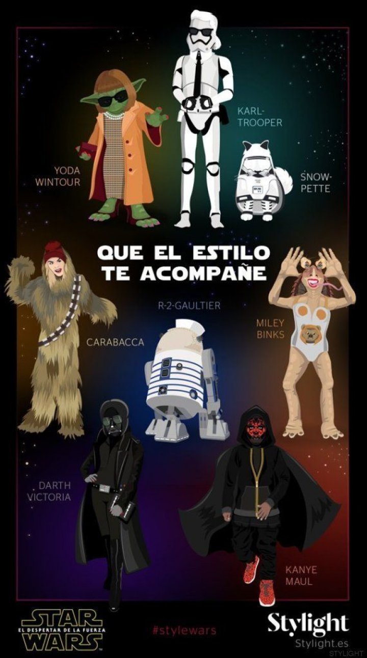 Karl Lagerfeld, Anna Wintour, Kanye West, Victoria Secret, Miley Cyrus y Jean Paul Gaultier se convierten en protagonistas de esta serie hecha en colaboración con la web de moda stylight.es. Un ivertido intercambio galáctico en el que se incluyen Yoda, R2-D2 ¡y hasta Chewbacca!