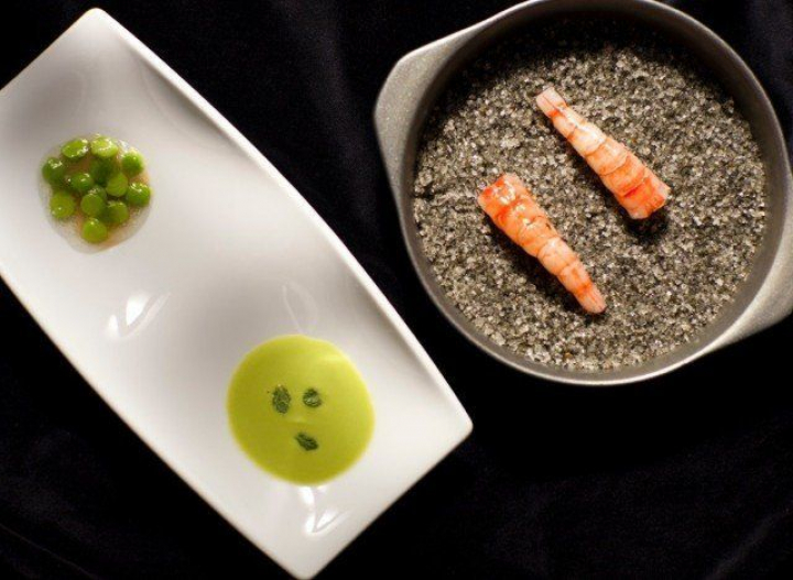Metemos la sal en el horno, mientras juntamos los guisantes pelados con el gel de jamón, en un plato de dos hendiduras en una pondremos la crema de guisantes con una juliana de hierbabuena, y en el otro pondremos un punto del gel de gamba, encima los guisantes con jamón y dos puntos del licuado, las colas de gamba se servirán atemperadas encima de la sal caliente.