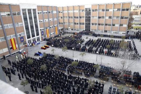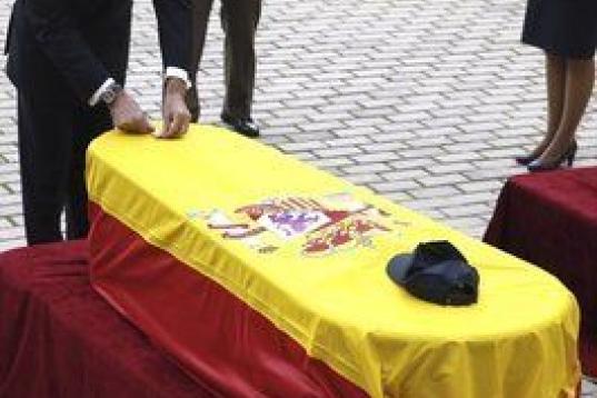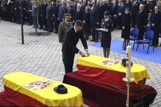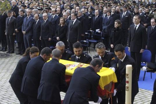 Los reyes, el presidente del Gobierno, Mariano Rajoy, y los líderes de los principales partidos políticos han acompañado a los familiares de los dos policías asesinados el pasado viernes en un atentado talibán en Afganistán en el funeral homenaje celebrado en el complejo policial de Canillas, en Madrid.