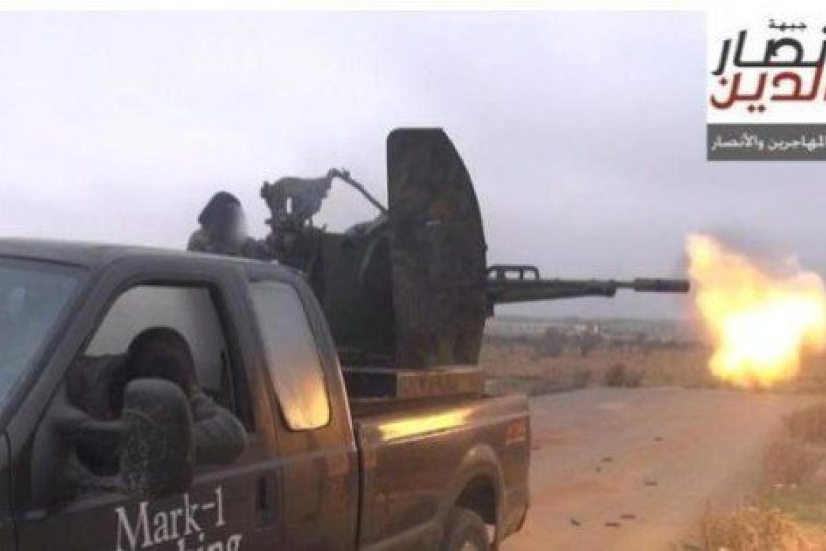 La furgoneta la conduce una persona que oculta su rostro, y en la parte trasera del vehículo va montada otra persona que dispara al horizonte con una ametralladora antiaérea, ambos supuestos miembros de las Brigadas de Al-Muhajireen, un grupo yihadista que lucha contra el Gobierno en Siria y que estuvo afiliado durante un tiempo al Estado Islámico (EI).