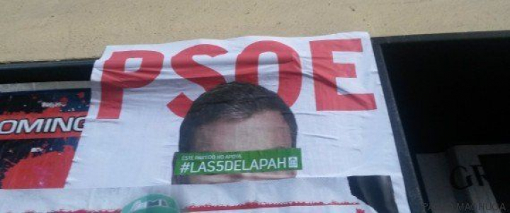 Cartel del PSOE tapado con una pegatina de la PAH en una calle de Vallecas