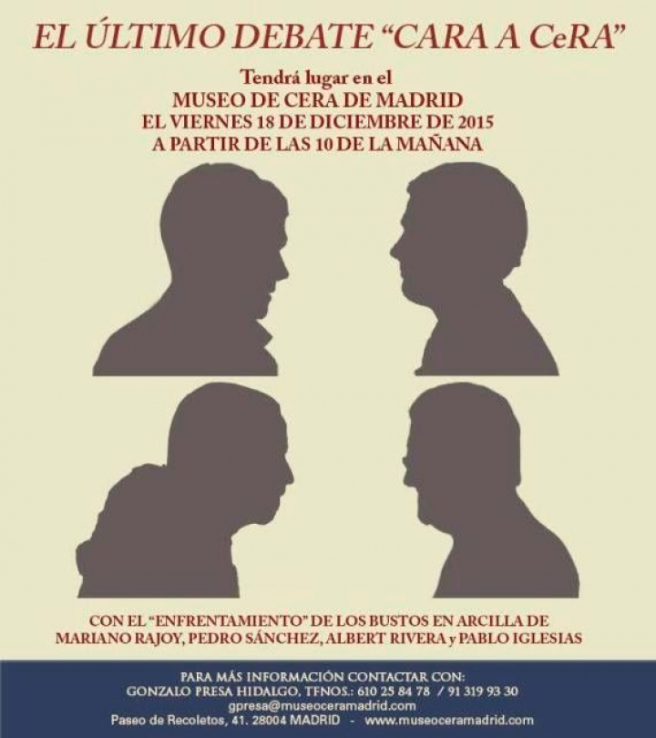 Durante esta campaña, la negativa de Mariano Rajoy ha hecho imposible ver un debate entre él, Pedro Sánchez, Pablo Iglesias y Albert Rivera. Pero eso va a cambiar este viernes… o casi. El museo de cera de Madrid organiza durante todo el día lo que ha calificado como ‘El último debate cara a cera’, un evento en el que se enfrentarán los bustos en arcilla del presidente del Gobierno, del líder del PSOE, del secretario general de Podemos y del presidente de Ciudadanos.
