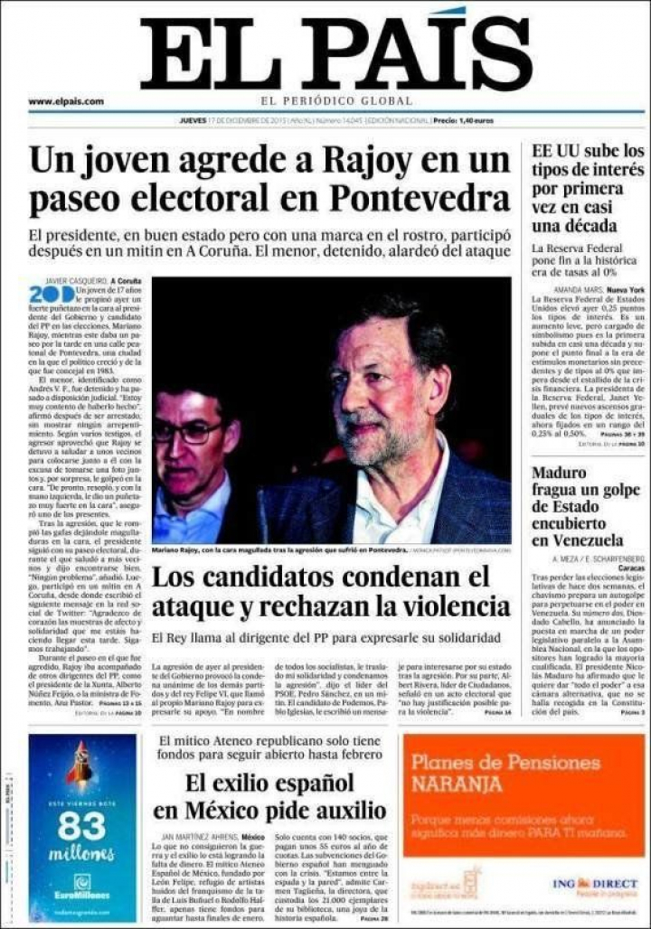 La tranquilidad en los ojos de Rajoy y esa media sonrisa -que es ya casi un rictus en su cara-contrasta con el rostro enrojecido por el puñetazo recibido y aún más con la consternación que, a su lado, trasmite uno de sus guardaespaldas. "Con Rajoy, con la campaña", proclama El País en un editorial en el que resalta que España es un país tolerante y atribuye lo sucedido a un joven descarriado.