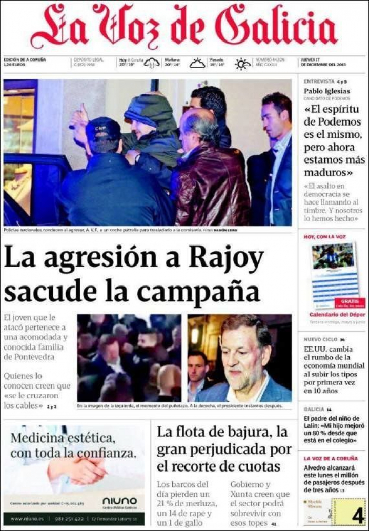De hecho, La Voz de Galicia destaca ya en su primera página que el agresor "pertenece a una acomodada y conocida familia de Pontevedra" y que "quienes le conocen creen que se le cruzaron cables". Sin embargo, El Mundo le sitúa como integrante de la "extrema izquierda", y La Razón, que cita al propio joven para elevar lo sucedido a "atentado al PP", extiende las responsabilidades a "quien fomenta el odio al PP".