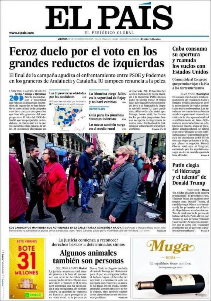 Y en este particular sprint nos encontramos con un "feroz duelo por el voto en los grandes reductos de izquierda... entre PSOE y Podemos, en los graneros de Andalucía y Cataluña", y giros estratégicos como el que reseñan ABC, El Mundo y La Razón: el PP fija en cinco puntos la ventaja necesaria para gobernar y no descarta una coalición con el PSOE.