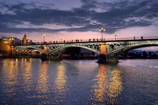 Ya lo decía la canción: "Sevilla tiene un color especial". Lo que no decía es que de noche, en el Puente de Isabel II, mucho más conocido como el Puente de Triana, ese color es todavía más especial. La arquitectura se mezcla con la natural...