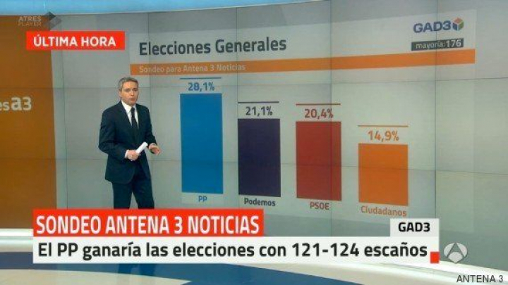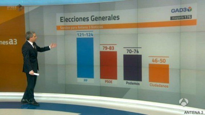 También el sondeo de GAD3 para Antena 3, da ganador al PP con entre 121 y 124 escaños pero no alcanzaría una mayoría suficiente para gobernar ni siquiera con el apoyo de Ciudadanos, según el sondeo de GAD3 para Antena 3.
