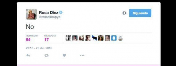 "No". El tuit más enigmático de Rosa Díez este domingo tenía únicamente dos letras. Y lo ha borrado inmediatamente, a pesar de lo cual está dando mucho de qué hablar en Twitter.