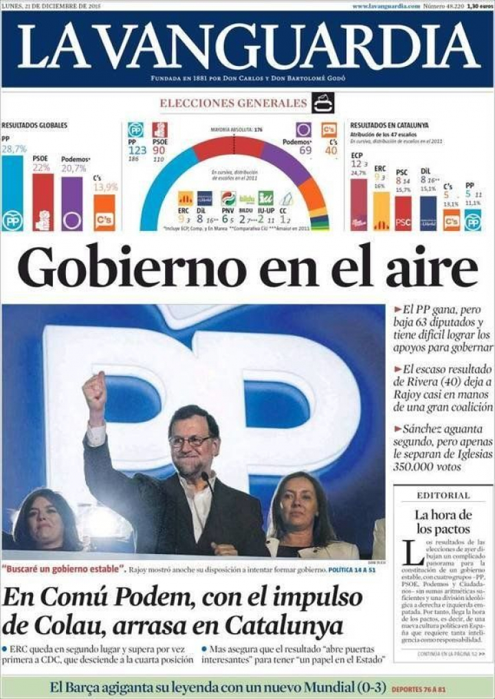 Cataluña, de hecho, va a ser una de las claves en la formación del nuevo gobierno, a juicio de Lluis Bassets, para quien ahora "más vale Mas que marzo", en alusión a una eventual repetición de los comicios. La Vanguardia, en cualquier caso, señala que el independentismo ha sumado sólo 17 escaños de los 47 posibles y que, por tanto, la "tercera vía" gana terreno.