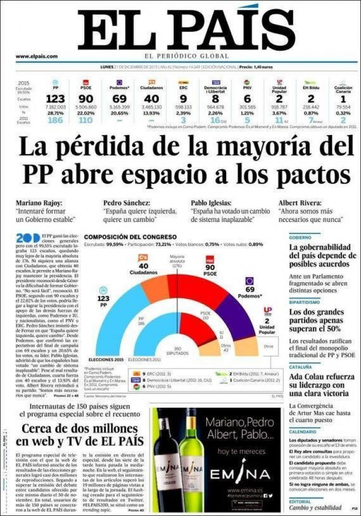 "Los españoles vamos a dar la bienvenida a 2016 sin saber qué gobierno nos espera: si Mariano Rajoy conseguirá repetir mandato, o si será una coalición de izquierdas liderada por el PSOE, o si tendremos que volver a las urnas el próximo mes de mayo. Son nada menos que tres escenarios, todos ellos sumamente complejos de construir, los que se abren después de un 20D en el que la única certeza es que este país ha roto con su pasado".