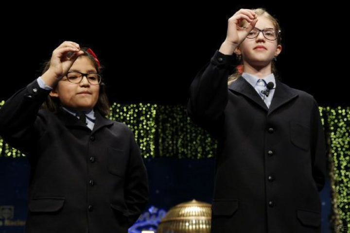 Lorena Stefan y Nicol Valenzuela muestran las bolas del número 79.140, agraciado con el Gordo de Navidad