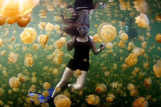 Los residentes del Jellyfish Lake de Eli Malk —una de las Rock Islands de Palau— rodean a una chica haciendo snorkel durante su inmersión. Las medusas de agua salada del lago, inofensivas para los humanos, pasan gran parte de su vida siguie...