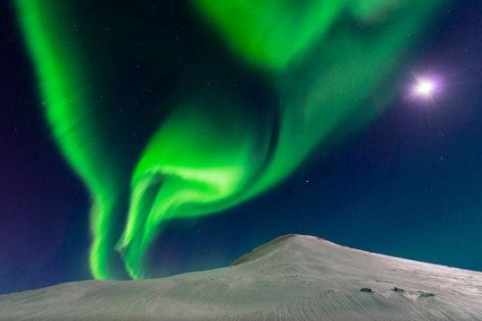 La aurora boreal comparte el cielo con una brillante luna en Islandia. Llamada así por Aurora, la diosa romana del amanecer, los haces de luz son el resultante de la colisión entre partículas en la atmósfera terrestre.