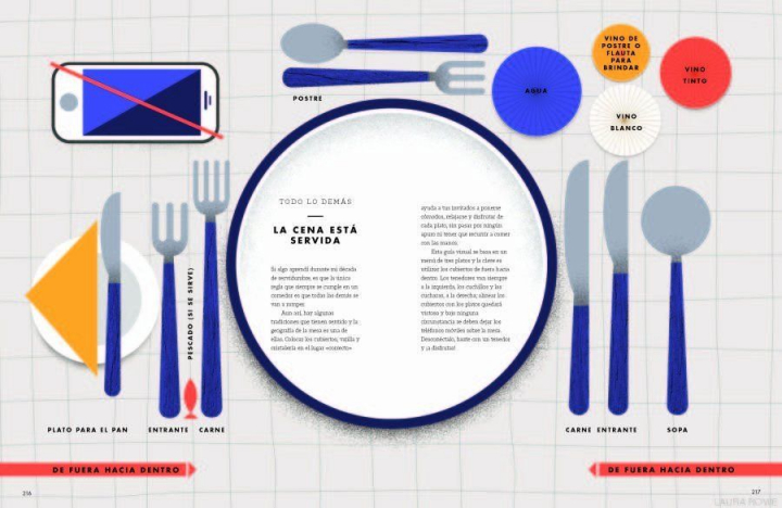 Calma: esta ilustración ayudará a unos y a otros. Así todos sabrán que, de izquierda a derecha, los cubiertos se empiezan a poner por el cuchillo del pan (o de la mantequilla), el tenedor pequeño, el tenedor del pescado (si se usa) y el tenedor principal. Después del plato van el cuchillo de la carne, el del entrante y la cuchara para la sopa. Comensales, lo tenéis aún más fácil: se empieza a comer desde el borde hasta el centro. Y vuestro pan, siempre es el de la izquierda.