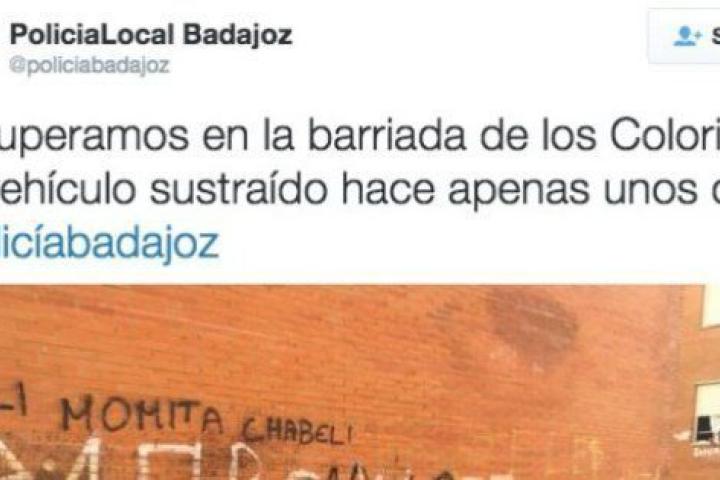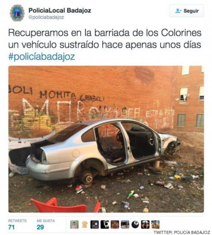 En un tuit que posteriormente fue eliminado, la Policía de Badajoz informaba de que se había recuperado en la barriada de los Colorines un vehículo "sustraído hace apenas unos días". La foto que aparecía junto al mensaje era la de un coche destartalado, sin asientos, ni ruedas, en una zona abandonada.