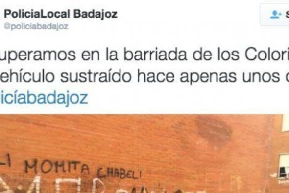 En un tuit que posteriormente fue eliminado, la Policía de Badajoz informaba de que se había recuperado en la barriada de los Colorines un vehículo "sustraído hace apenas unos días". La foto que aparecía junto al mensaje era la de un coche destartalado, sin asientos, ni ruedas, en una zona abandonada.