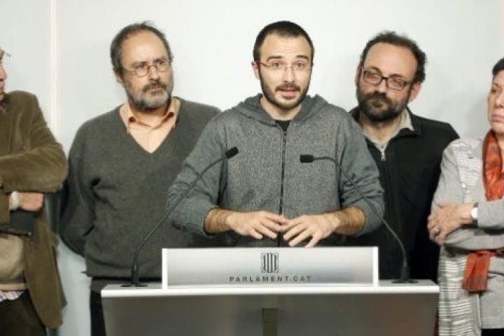 Los diputados de Catalunya Sí que es Pot Joan Coscubiela (c), Lluis Rabell (d), y Albano Dante (i), en sus escaños durante el pleno del Parlament que debate y vota hoy la resolución conjunta de Junts pel Sí y la CUP que pretende ser el inic...