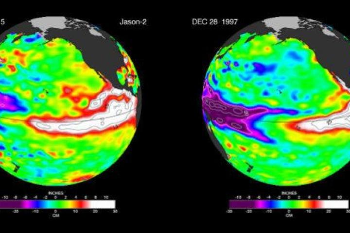 La imagen más reciente del satélite Jason-2, correspondiente al 27 de diciembre, tiene un parecido sorprendente a la del 28 de diciembre de 1997, tomada por su antecesor Topex/Poseidon, durante el último gran evento de El Niño. Ambos reflejan el patrón clásico de este fenómeno completamente desarrollado.