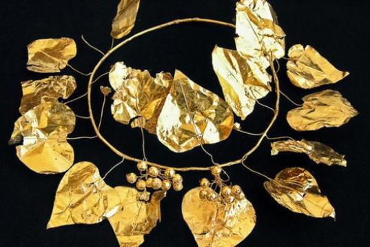 Cerca de Soli, en la mediterránea isla de Chipre, se descubrieron tesoros tan extraños como esta corona funeraria dorada, que reposaba en una tumba aristocrática de 2.400 años de antigüedad.