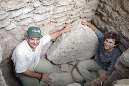 Marcello Canuto (izquierda), director del Instituto de Investigación de la Universidad de Tulane en Estados Unidos, y Luke Auld-Thomas dieron con un monumento maya en piedra muy bien conservado mientras realizaban excavaciones en Guatemala.