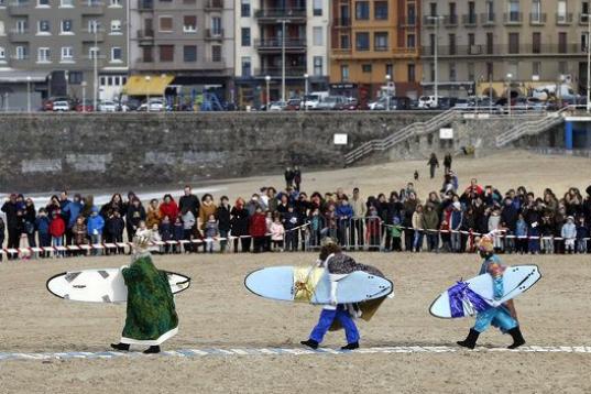La jornada que tienen por delante no les ha restado fuerzas y otro año más han querido pasearse por todas las ciudades y pueblos de la geografía española. A San Sebastián han llegado sobre una tabla de surf, a Madrid lo han hecho en avión con un curioso atuendo (más de Teletubbie que de Rey Mago) y en Barcelona se han paseado junto a la alcaldesa Ada Colau.