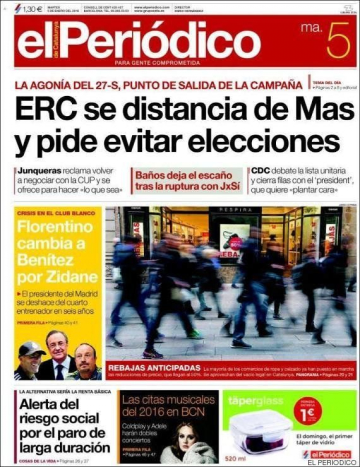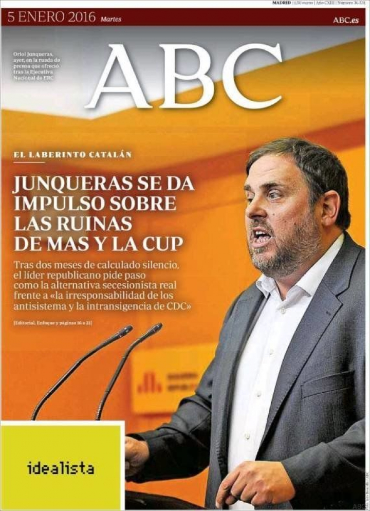 Precisamente, desde esta óptica, llama la atención el titular de ABC: "Junqueras se da impulso sobre las ruinas de Mas y la CUP". En el fondo, como nos explica Carmen del Riego en La Vanguardia: "el adelanto electoral catalán dificulta la estrategia de Rajoy" porque no puede utilizar un gobierno independentista en Cataluña para presionar al PSOE para que apoye su investidura. En este contexto, El País destaca que "el ala catalana de Podemos tantea la opción electoral de Ada Colau fuera de Barcelona".