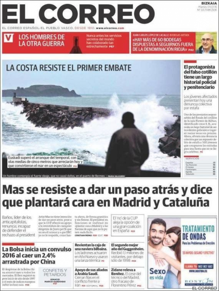 En este escenario, El Correo, en un editorial, asegura que es necesaria una "Generalitat sin Mas". "Antes de una nuevas elecciones, lo que Cataluña necesita, argumenta- es que el nacionalismo recapacite y vuelva sobre sus pasos".