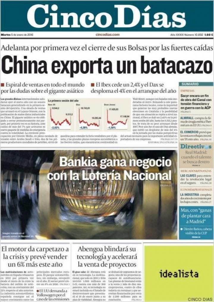 "China exporta un batacazo", titula de manera significativa el diario económico después de la espiral de ventas en todo el mundo por las dudas que general gigante asiático". Estamos ante "la volatilidad china", como la define El País en un editorial que añade la dificultad que supone para la economía española la desaceleración que se está registrando en los países emergentes latinoamericanos como consecuencia de la menor inversión china. Gideon Rachman, en Financial Times, busca los cisnes negros de la economía mundial para este año que se inicia y no duda en señalar a China como una de las "desagradables" sorpresas de 2016.