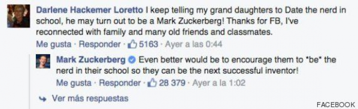 Entonces, una señora llamada Darlene Hackemer Loretto comentó la publicación de Zuckerberg, diciendo que siempre recomienda a sus nietas salir con el empollón de la clase ("nerd", en inglés) porque puede que acabe convirtiéndose en un Mark Zuckerberg.