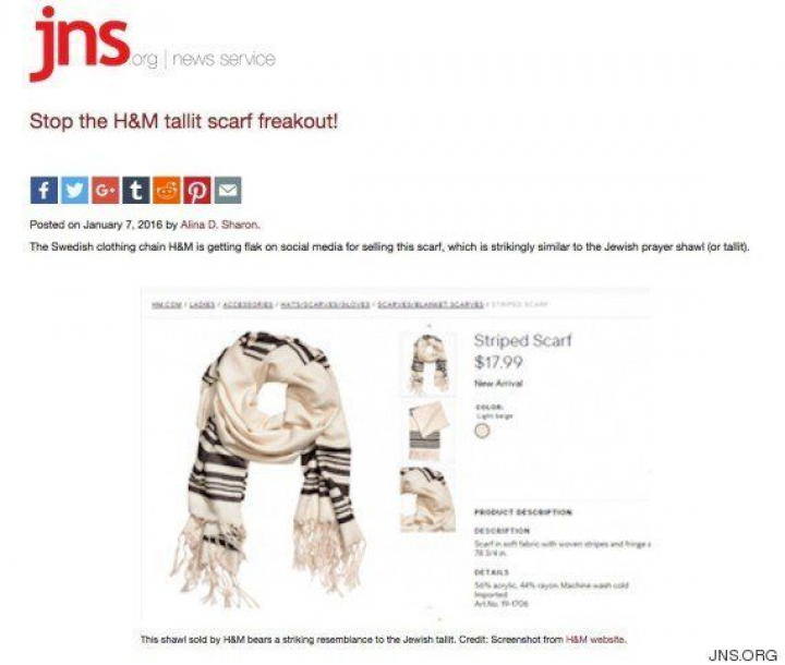 Entrada del portal de información judía JNS reclamando a H&M que deje de vender el pañuelo.