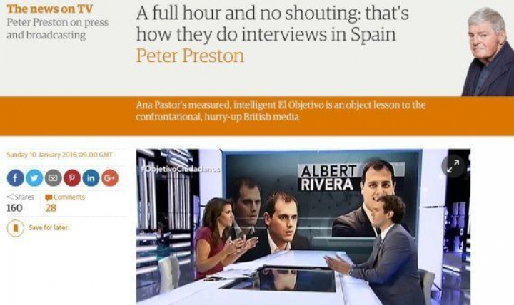 Preston toma como ejemplo la entrevista que Pastor le hizo a Albert Rivera (Ciudadanos) para felicitar al programa por tener "60 minutos de discusión política con sólo dos personas en pantalla", mientras que la BBC, en su opinión, no llega a la media hora. Además valora su estilo y la apuesta única por la información sin sillones ni sofás. "Ella no se reclina (...) Son ella y él sentados, seriamente, a los dos lados de un escritorio", ensalza.