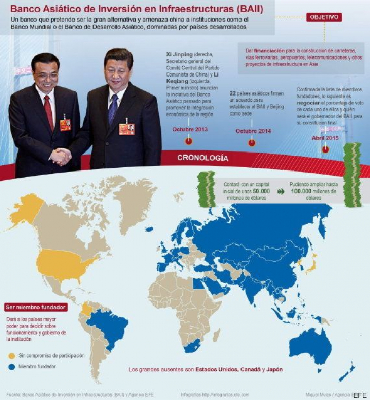 Los otros dos grandes accionistas del banco son la India, que invertirá 8.367 millones de dólares (7.600 millones de euros) y Rusia, con 6.536 millones de dólares (6.000 millones de euros), seguidos por Alemania y Corea del Sur.