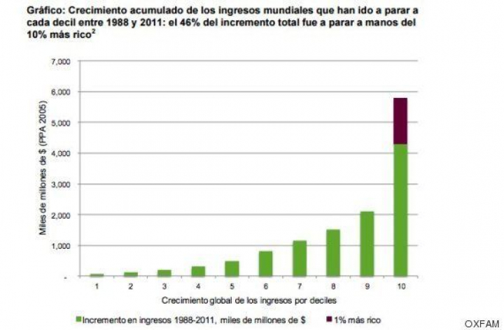 Las 62 personas más ricas del mundo tienen tanta riqueza como la mitad de los más pobres del planeta, unos 3.600 millones de personas. La brecha entre ricos y pobres se ha ampliado "dramáticamente" en los últimos 12 años y ha alcanzado cotas "insoportables", advierte Oxfam. El sistema está "distorsionado" y favorece a los que más tienen.