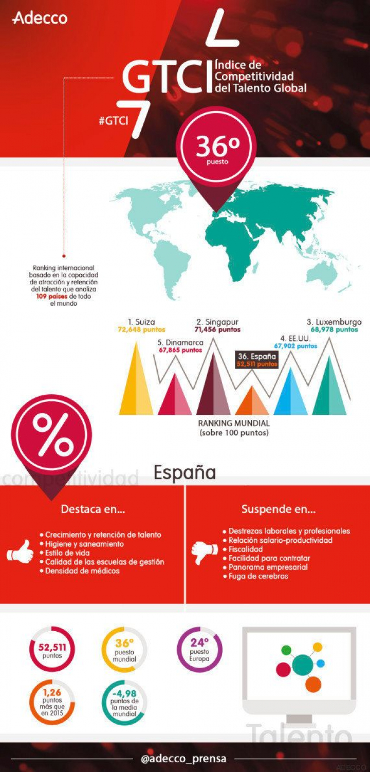 DAVOS-. Mejora levemente, pero sigue sin llegar al aprobado. España ocupa el puesto 36 de 109 países en el Índice de Competitividad por el talento Global, un ranking mundial basado en la capacidad de atracción y retención del talento. Tanto es así que ocupa uno de los peores puestos de la lista en cuanto a 'fuga de cerebros' se refiere.