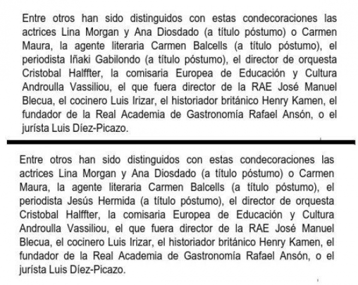 Como el Ministerio ha aclarado en una nota enviada unos 10-15 minutos después (en la imagen de arriba, ambas notas) se trataba de "un error imperdonable": "Es a Jesús Hermida (a título póstumo), y no al periodista Iñaki Gabilondo, a quien se le ha concedido la Gran Cruz de la Orden Civil Alfonso X El Sabio", se disculpan.