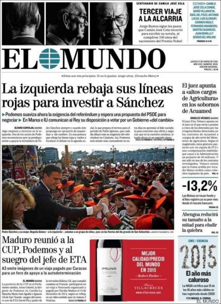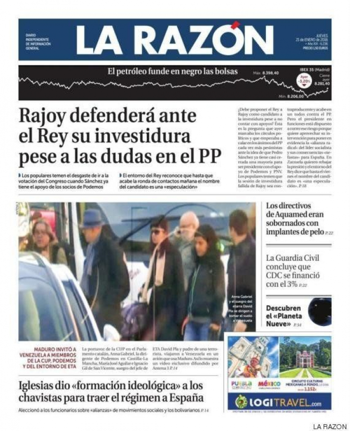 No muy bien, la verdad. ABC editorializa sobre "la peligrosa tentación del poder" en alusión a Sánchez y su subdirector, Luis Ventoso, llega a considerar en su columna que "un gobierno de Sánchez, legal pero ilegítimo, sembrará una gangrena social". Así que La Razón y El Mundo destacan una información que anoche adelantó en exclusiva la televisión Antena 3, en la que se consigue el reto periodístico de agrupar en el mismo titular al presidente de Venezuela, la CUP, Podemos y ETA: "Maduro reunió a la CUP, Podemos y al suegro del jefe de ETA", en referencia a un viaje pagado por Caracas para un foro de apoyo a la autodeterminación en el que participaron Anna Gabriel, el suegro de David Pla, supuesto número uno de ETA, y la dirigente de Podemos en Castilla-La Mancha, María José Aguilar.