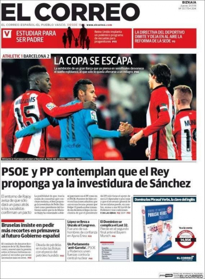 La situación es tan incierta que hasta El Correo asegura que "PSOE y PP contemplan que el Rey proponga ya la investidura de Sánchez". Una eventualidad que descarta la especialista de La Vanguardia en la Casa Real. Mariángel Alcázar estima que "aunque Sánchez comunique a Don Felipe... un principio de acuerdo con otras formaciones políticas... difícilmente el Rey negará a Rajoy la posibilidad de exponer ante el Congreso su programa de gobierno..."