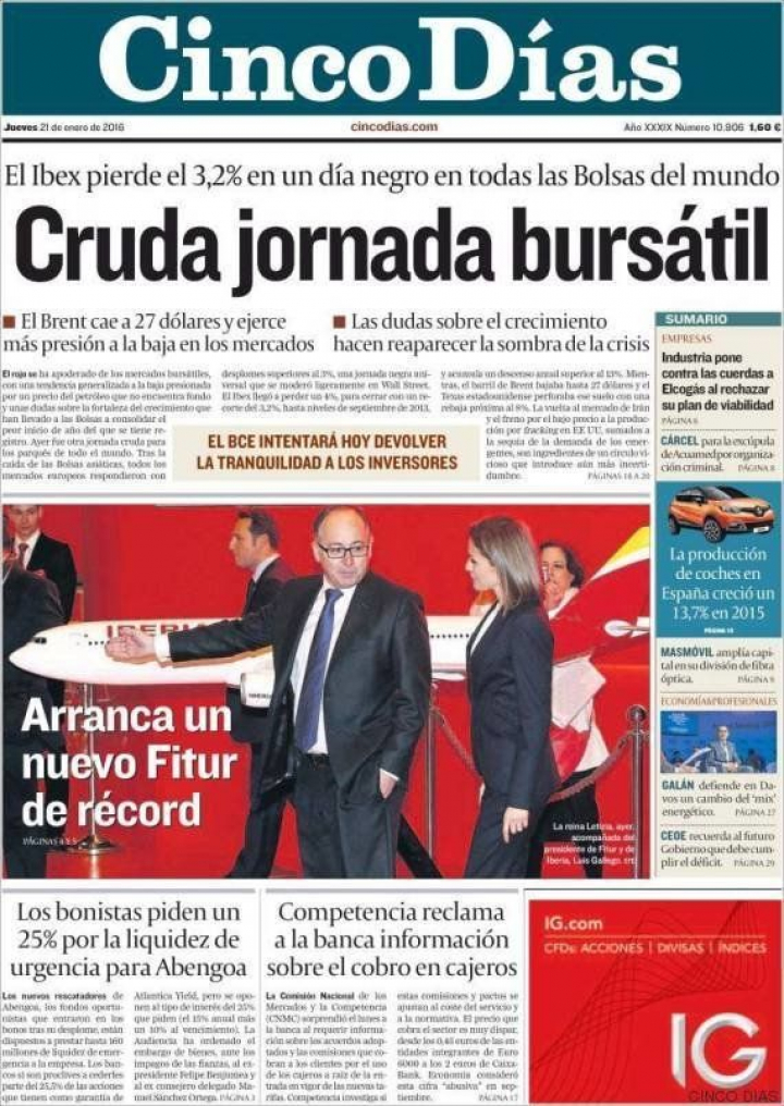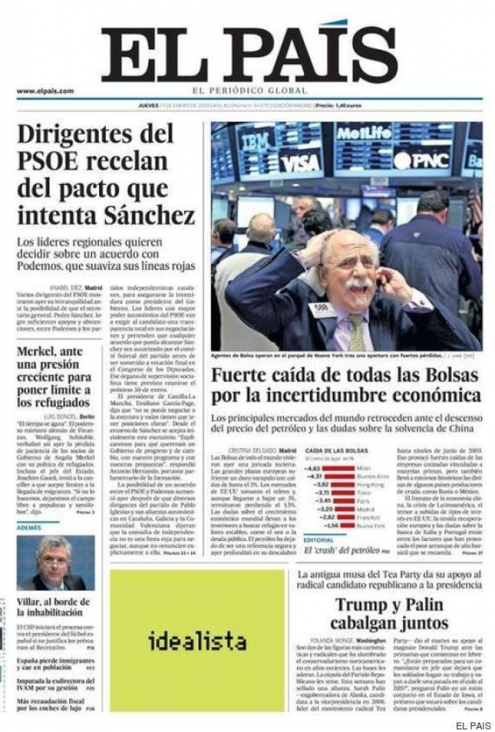 Con esa "cruda jornada bursátil", como la califican Cinco Días y que El País, en un editorial atribuye al crash del petróleo un efecto secundario de los temores sobre la economía china. A la que se podría añadir, si hacemos caso a Le Monde, a Rusia: la economía rusa se prepara para el peor de los escenarios arrastrada también por la el descenso del precio del petróleo.