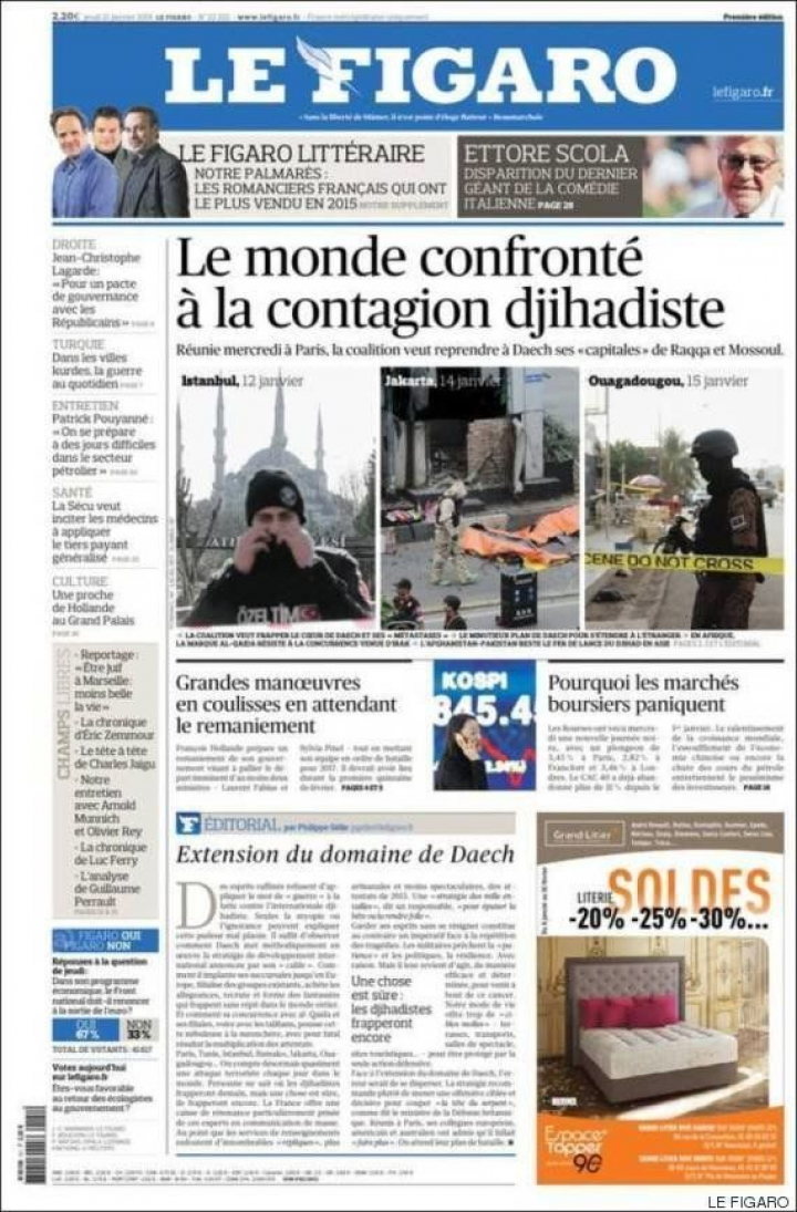 Tras la reunión de ayer en París de los países que conforman la coalición que les combate en Siria e Irak, Le Figaro titula: "El mundo se enfrenta al contagio yihadista" sobre la foto de los atentados de Estambul, Yakarta y Ouagadougou que han marcado este mes de enero. El yihadismo ha causado un millar de muertos en 70 atentados en los tres últimos meses. LLuis Bassets estima en El País que "la primera victoria del ISIS es durar, pero la segunda es su capacidad expansiva global". Incluido en Europa, donde, a su juicio, y a falta de pruebas fehacientes, es bastante verosímil que en la noche de Año Nuevo se produjera una coordinación en los ataques sexuales a mujeres en 12 ciudades de cinco países. "Este tipo de comportamientos sólo pueden satisfacer a los cerebros del Daesh".