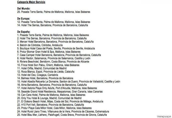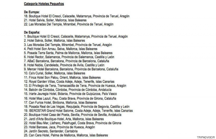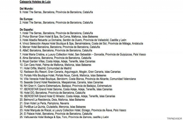 El hotel con mejores servicios es la Posada Terra Santa de Palma de Mallorca (puesto 25 del ránking mundial); el más lujoso es el The Serras Barcelona; la casa rural Jesuskoa en Guipúzcoa gana en mejor calidad-precio y la Boutique Hotel Cresol, en la provincia de Teruel, se impone como mejor hotel pequeño.