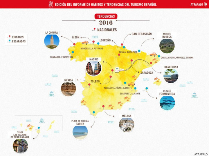 El texto aventura cuáles son las diez ciudades españolas que más se visitarán en 2016 y cuáles serán los city-breaks o escapadas que más demandarán los españoles. Entre las primeras destacan Gijón, Ciudad Europea del Deporte 2016; San Sebastián, Capital Europea de la Cultura; Mérida, que una vez más destaca por su gastronomía proclamándose como la Capital Iberoamericana de la Cultura Gastronómica en 2016; o Toledo, Capital Gastronómica de España 2016. El informe apunta también que Pasaia, en Guipúzcoa, estará de moda este año gracias a la exposición Víctor Hugo, viaje a la memoria y la Playa de Bolonia, en Tarifa, seguirá siendo tendencia por los numerosos premios que recibe cada año.
