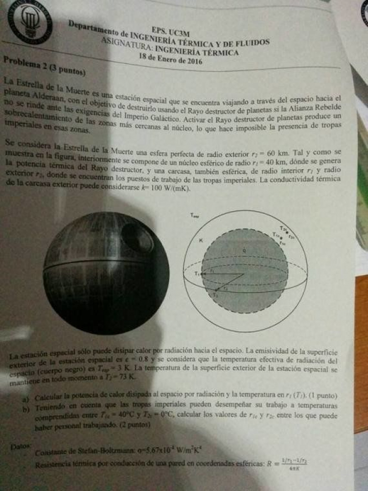 Los alumnos de Ingeniería Térmica de la Universidad Carlos III de Madrid se encontraron con una divertida sorpresa el pasado lunes en el examen final de la asignatura. En el segundo problema de la prueba, perteneciente al departamento de ingeniería térmica y de fluidos, se les cuestionaba sobre La Estrella de la Muerte, una estación espacial ficticia dentro del universo de la película Star Wars.