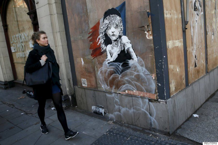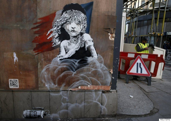 El mural del misterioso grafitero muestra a Cosette, la niña de Los Miserables, con lágrimas en sus ojos y una lata de gas en la parte de abajo.